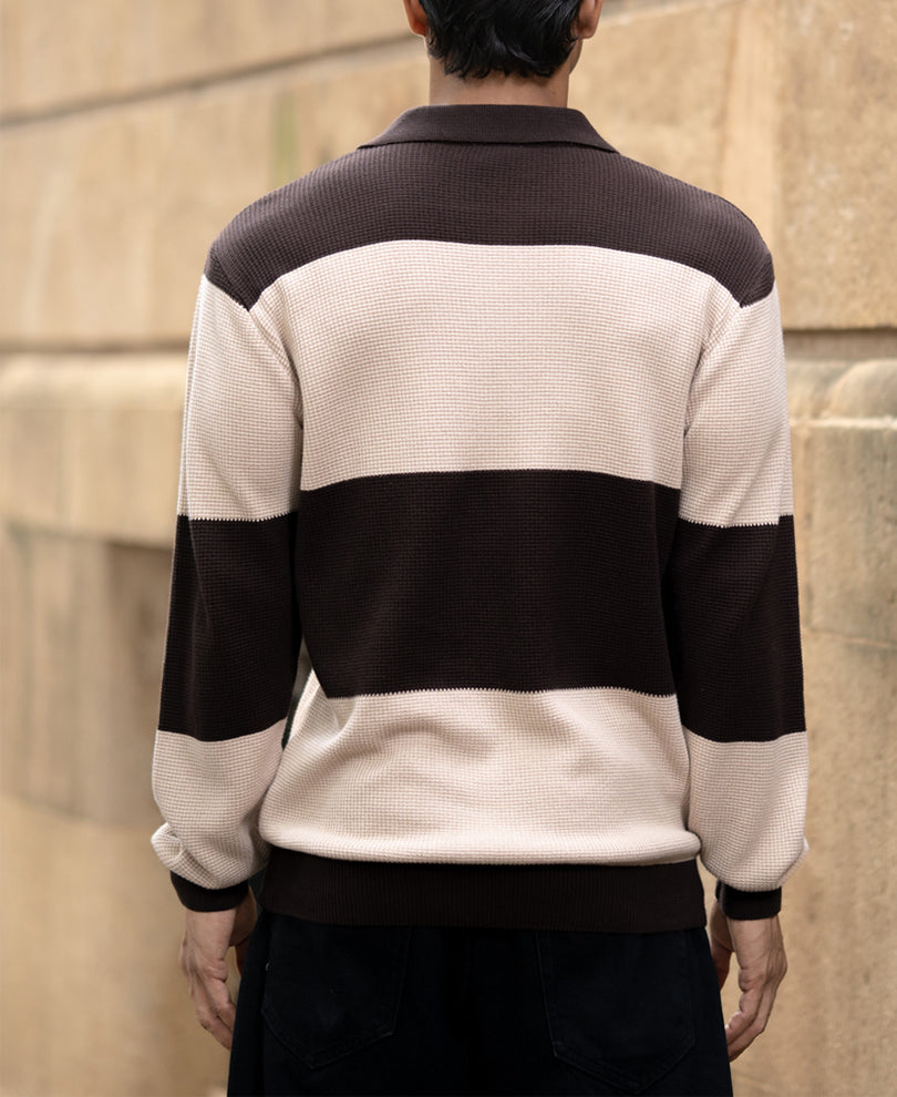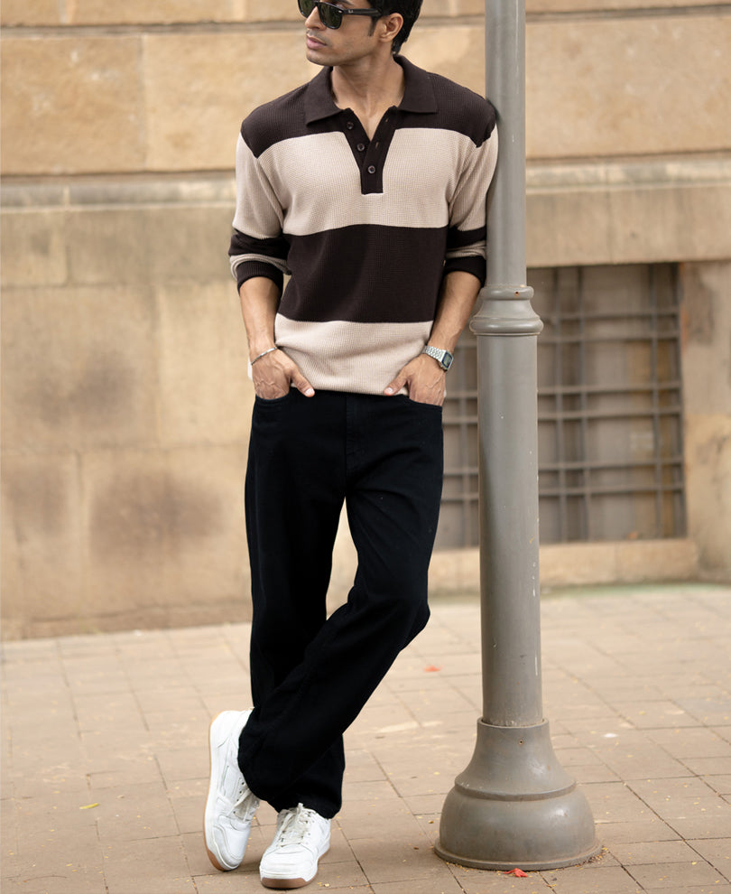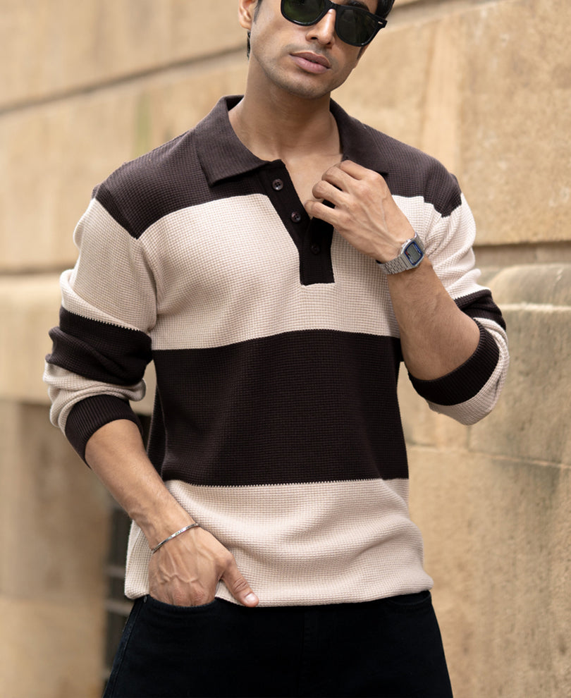 Texture meets ease in this striped knit tee. The earthy brown tones and subtle raised pattern give it a premium edge without losing its laid-back soul. Pair it with cargos or jeans for everyday easy styling.