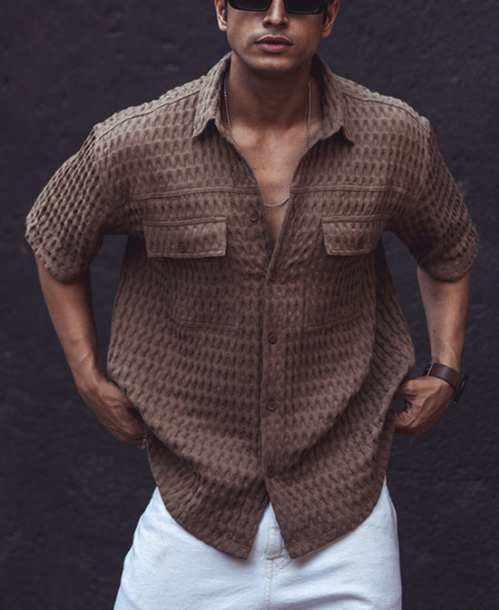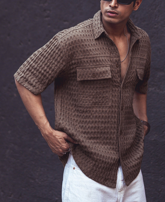 Keep it casual and chic with our brown structured oversized shirts for men, featuring double-chest pockets for style and added functionality, short sleeves, and a waffle texture. Easy to pair with everyday bottoms and made from premium fabric, the oversized shirt combines all-day comfort and styling versatility.