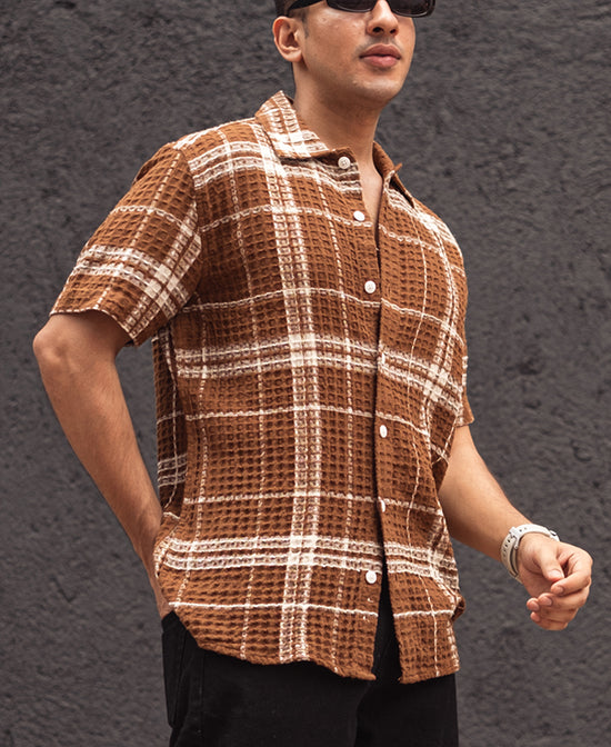 Brown Waffle Structured Checks Half Sleeves Shirt