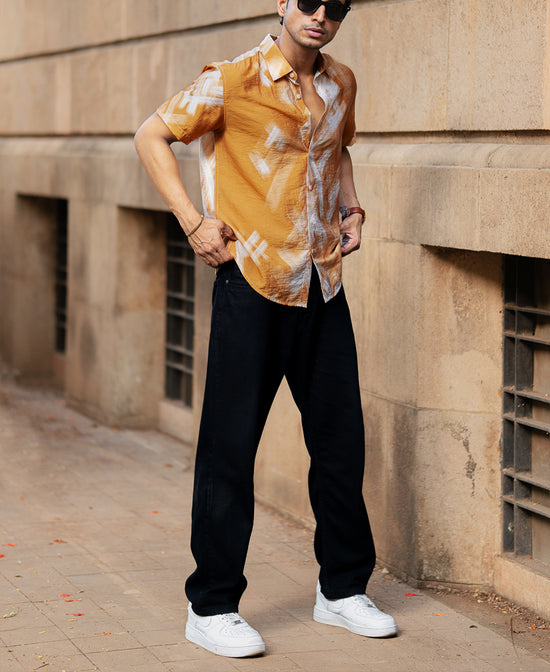 With abstract brushstroke patterns on rich butterscotch, this shirt plays like art in motion. Cut loose with a soft crinkled texture, it’s the kind of piece that doesn’t follow rules and looks even better when you don’t either.