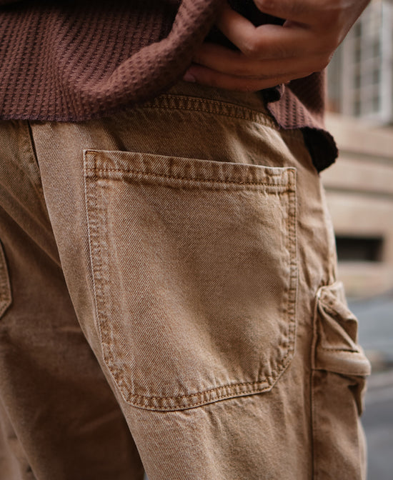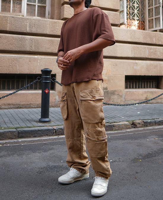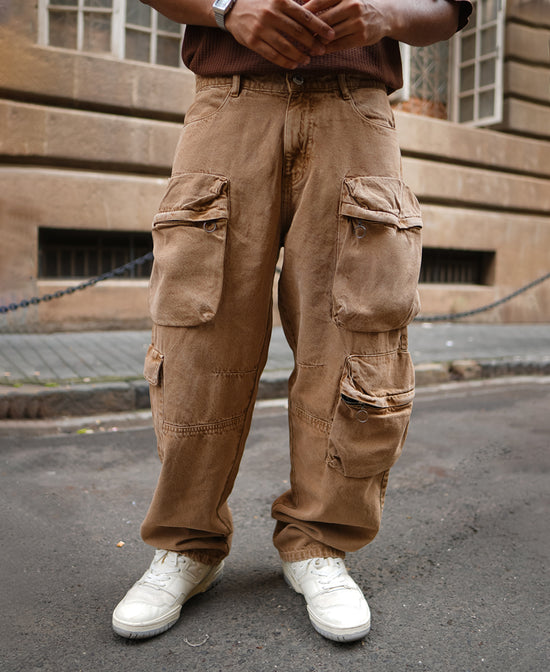 Adventure-ready with a rugged edge. These camel cargo jeans blend denim toughness with a baggy fit that moves with you. The functional pockets and earthy tone make them the go-to for days when you need style, comfort, and a little room to roam.