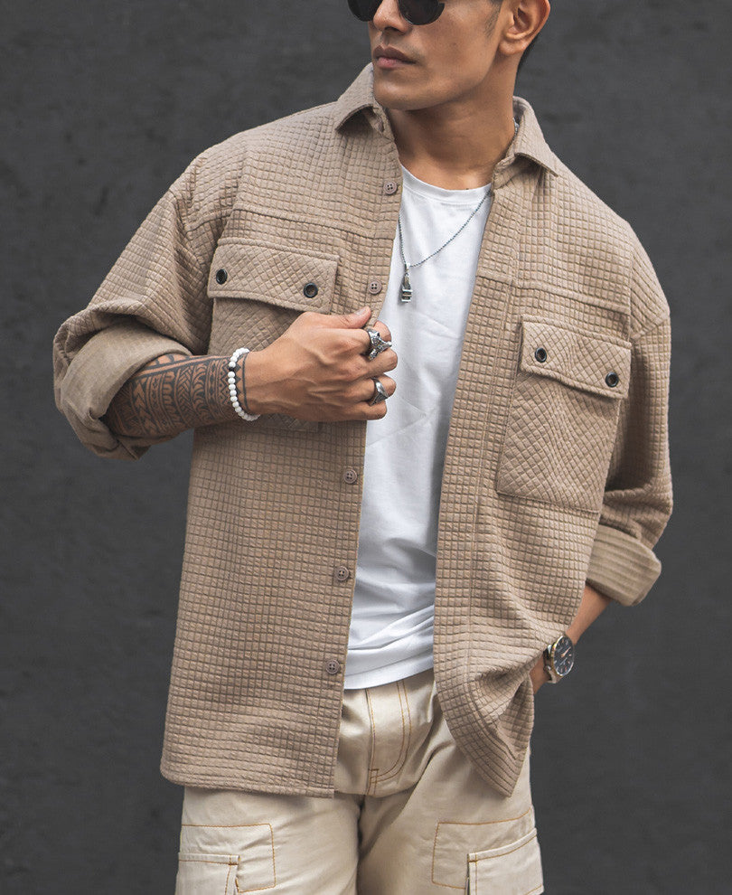 Dress to leave a lasting impression in our camel structured oversized shirts for men, featuring a spread collar, double flap pockets for essentials, drop shoulders, and full sleeves. Crafted from structured blend fabric, the oversized shirt blends comfort and elevated looks. Wear it solo or as a shacket to turn heads on the street.