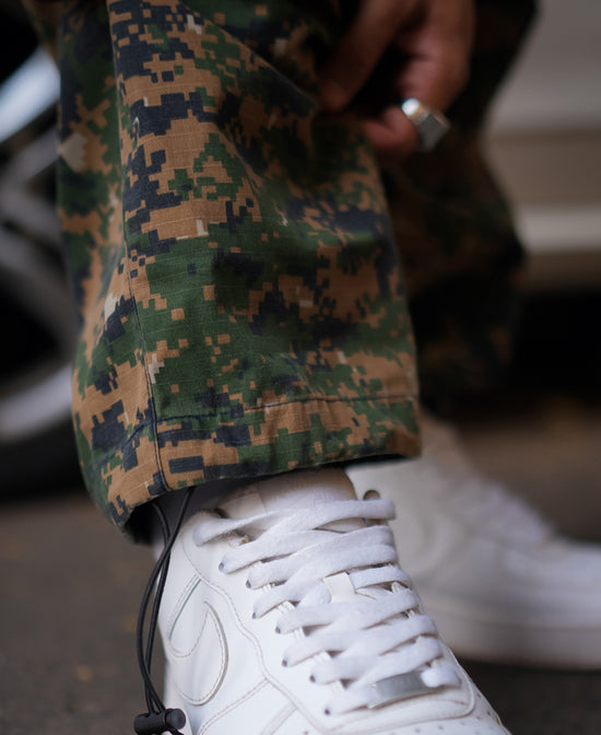 Make a tactical wardrobe upgrade with our camouflage parachute pants for men, featuring cargo pockets for extra utility. The casual fit is crafted from Cotton Blend fabric in a relaxed silhouette, offering comfort and a contemporary finish. Pair them with a neutral or graphic tee and sneakers to nail your streetwear.