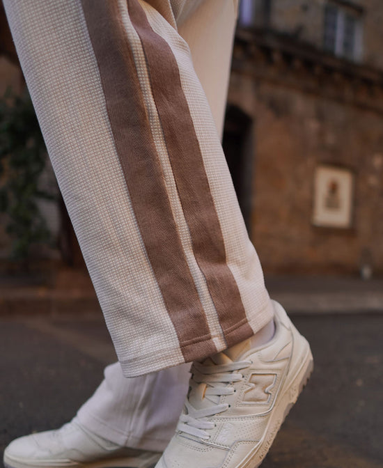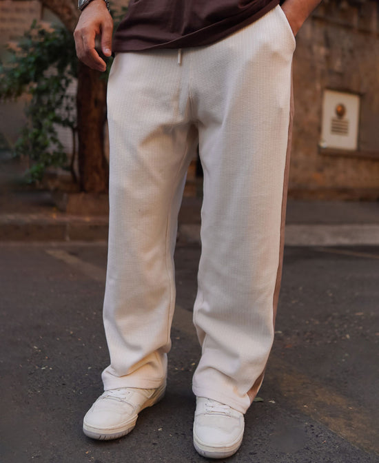 These cream striped baggy-fit track pants redefine comfort and style. Made with Cotton fabric, it offers a relaxed, oversized fit that's anything but sloppy. The structured design adds a touch of coolness, making them perfect for lounging at home, running errands, or kicking back after work. The classic black colour ensures versatility and allows you to pair them with any colour graphic tee.