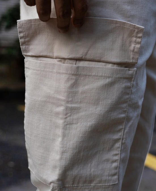 We've got our cargos, upgraded. In cream cotton with a regular fit, these pants strike the balance between utility and polish. Multiple pockets, clean silhouette, maximum wearability. From street to smart-casual, they move with ease.