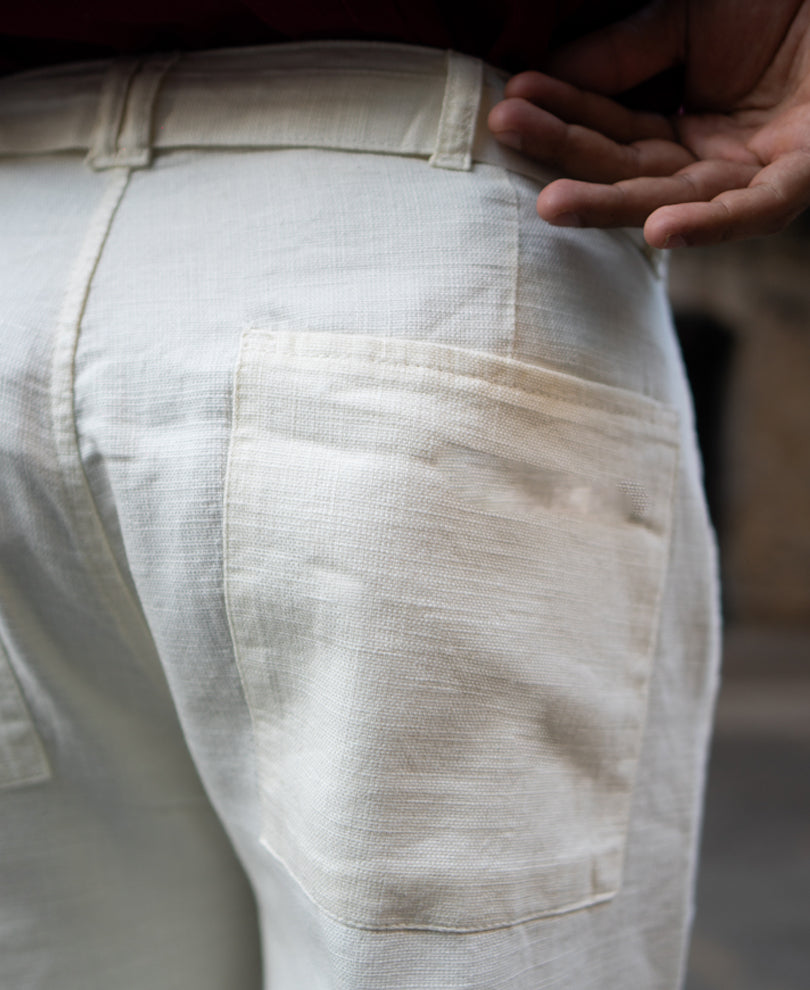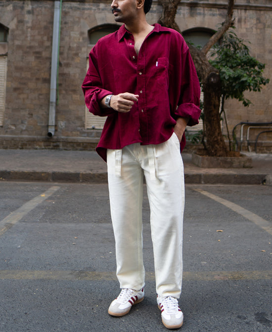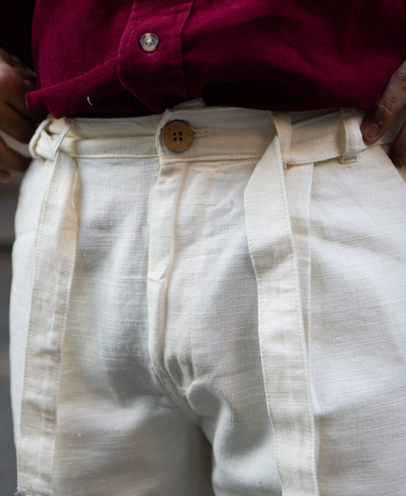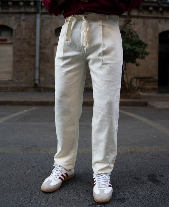 Soft, structured, and undeniably suave. These cream cotton pants come with a matching belt for a refined touch. The breathable fabric and tailored fit make them your go-to for smart-casual outings that demand quiet confidence.