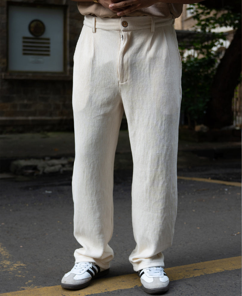 An elegant take on lounge-inspired tailoring, these trousers feature a rib-knit pleated texture in a soft cream hue. Designed with a relaxed yet structured fit, they bring effortless sophistication to casual dressing. Pair with polos, knit tops, or matching sets for a monochrome elevated aesthetic.
