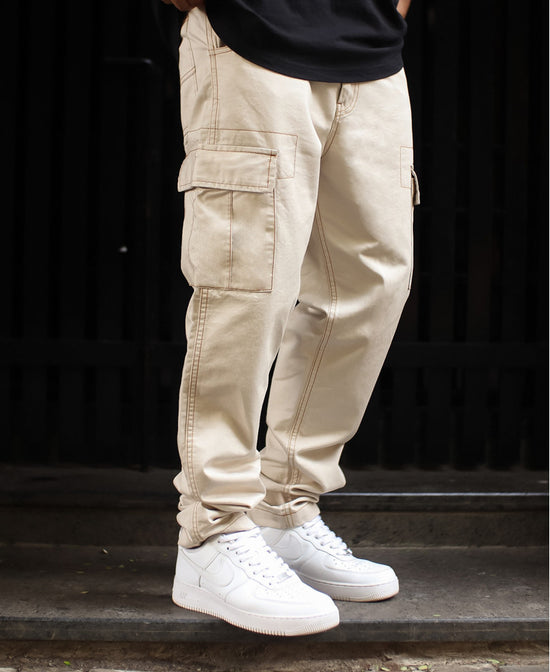 Cream cargo pants for men with a zipped front, cargo pockets, and regular fit. Whether you're running errands, hanging out with friends, or on a date, these pants are the epitome of urban cool. The premium fabric makes the cargo pants comfortable to wear all day. They offer space for essentials and go with just about anything — an all-in-one wardrobe upgrade.