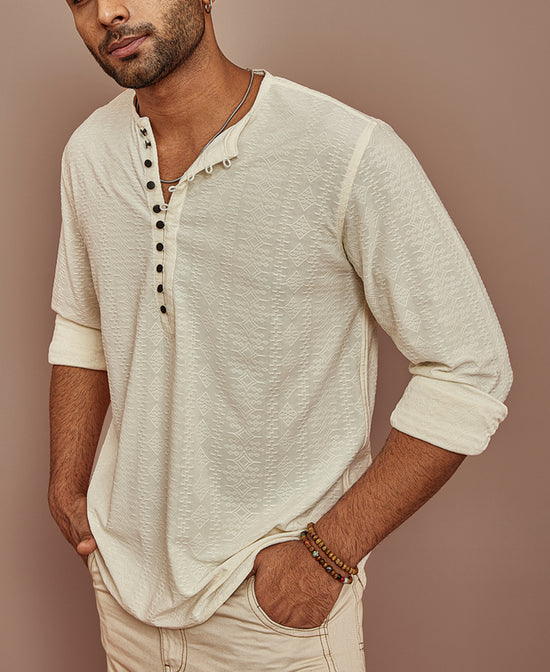 Upgrade your casual wardrobe with our cream kurta-style full-sleeved shirts for men. Crafted from soft, polyester fabric, the shirt features a unique textured fabric and a classic Henley neckline with button detailing. Its relaxed fit with rolled-up sleeves offers a laid-back vibe, perfect for any casual occasion. Pair it with jeans or trousers for an effortless statement.