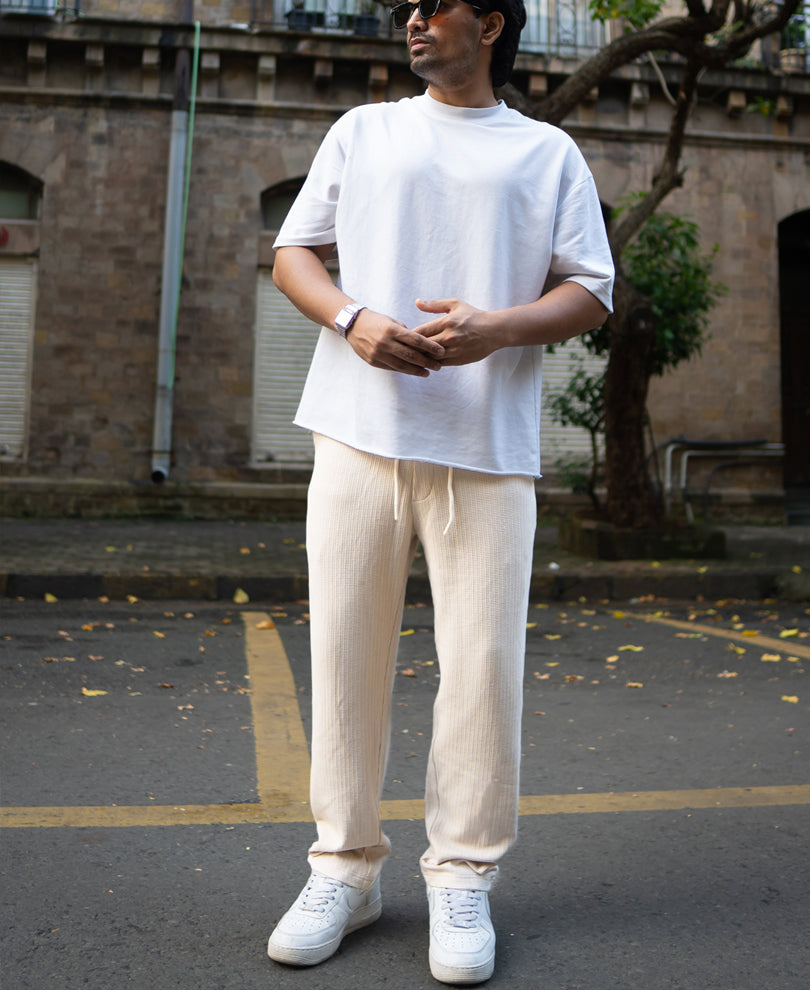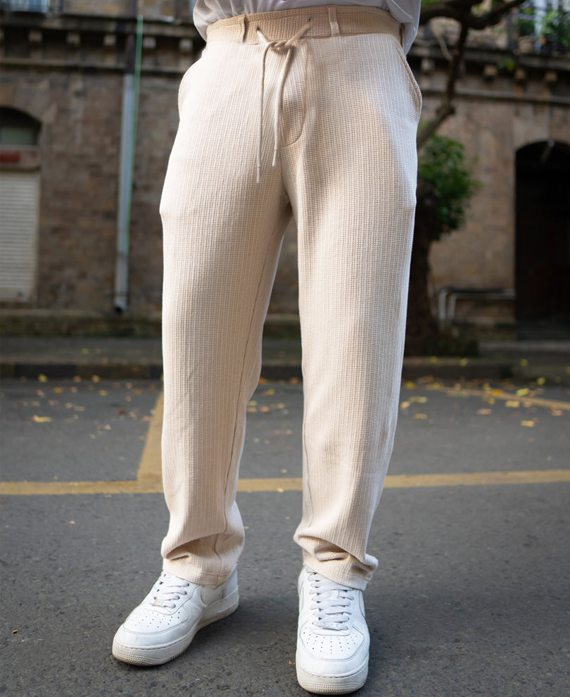 Crafted from textured cream fabric with a gentle structure, these trackpants balance tailored lines with lounge-level comfort. The regular fit works just as well with sneakers for errands as with loafers for a refined casual outfit.