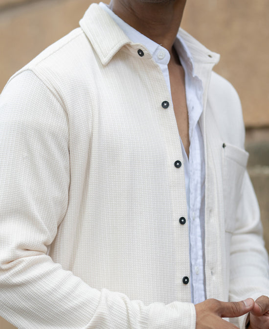 Effortlessly refined, this cream structured shirt pairs a clean silhouette with thoughtful detailing. The textured fabric adds depth, while the single chest pocket keeps it casual yet confident. A go-to for all the occasions when you want to carry elegance.