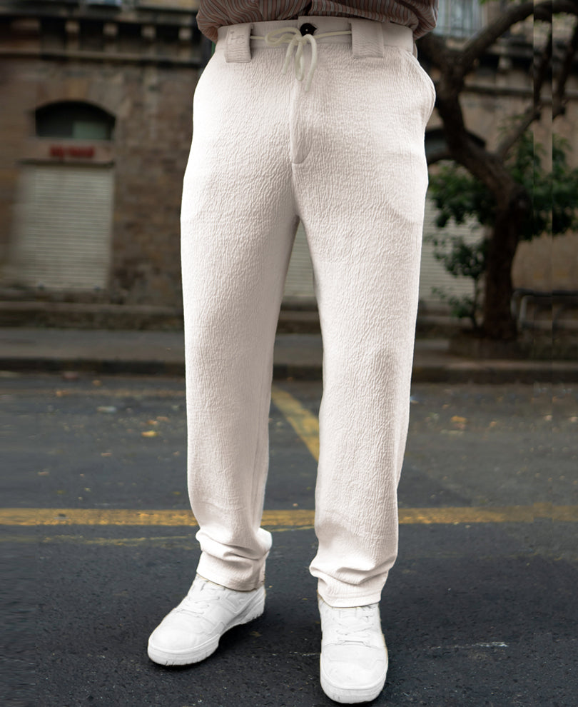 Comfort that looks sharp. These cream structured track pants redefine casual wear with their sleek fit and textured fabric. Whether you’re stepping out or lounging, they give you that put-together vibe without sacrificing ease. A perfect blend of style and function.