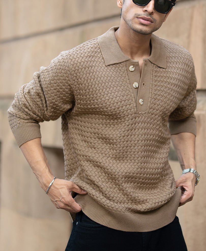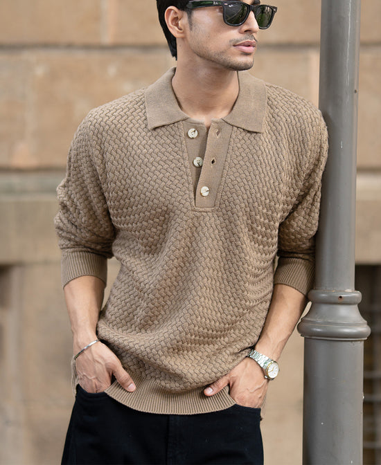 Minimal, refined, and irresistibly smooth. This knit polo sweater in dark beige is the kind of piece that quietly elevates your style. The textured knit adds depth, while the polo collar keeps it classic. Dress it up with tailored trousers or wear it casual with denims, it adapts as effortlessly as you do.