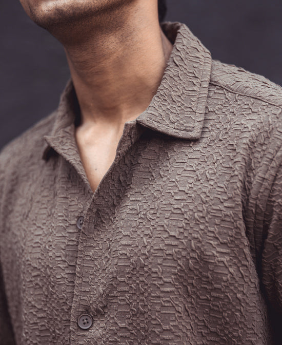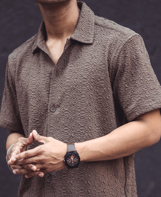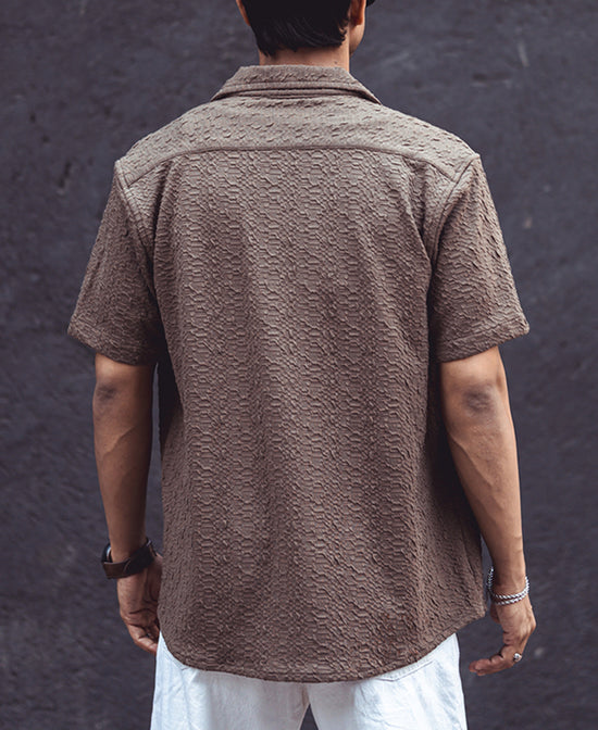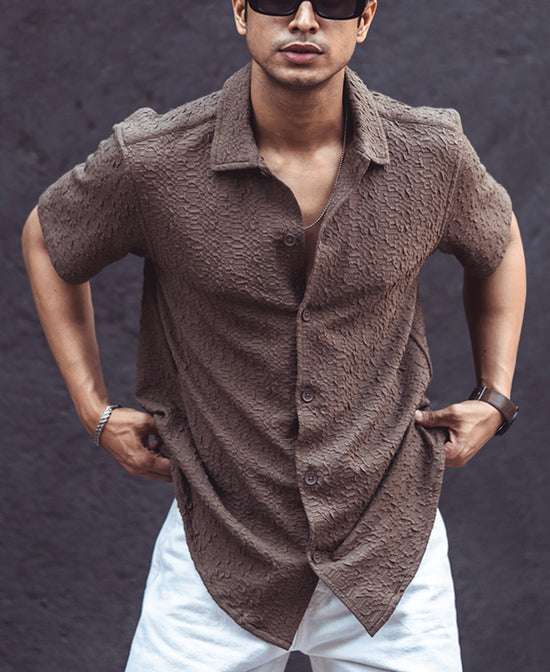 Upgrade your casual ensemble with our soft, textured dark beige half sleeves shirts for men. Crafted from a cozy fabric, the structured shirt features a classic collar and button-front design for all-day relaxation. Layer it over a tee for a comfortable yet polished appearance that effortlessly transitions from day to night.
