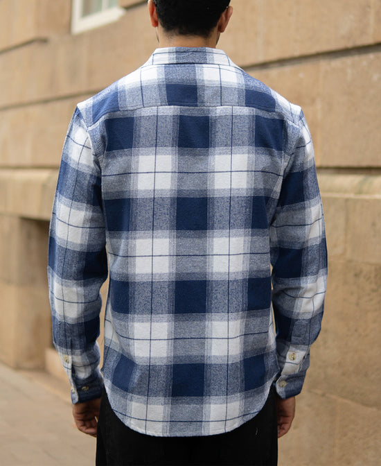 Cut in soft brushed cotton for a cozy handfeel, this shirt comes with large-scale checks in dark and mid-blue tones, balanced with white highlights. Featuring a buttoned placket and a chest pocket, it blends ruggedness with comfort. Style it open over a tee or buttoned for a sharp casual look.