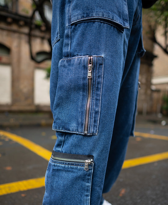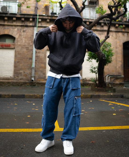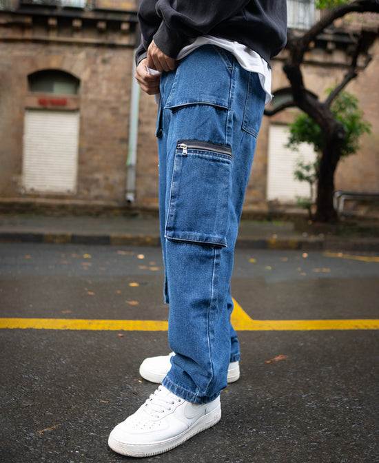 The Dark Blue Solid Baggy Fit Cargo Denim Jeans are the ultimate crossover between rugged utility and everyday style. Crafted from durable denim with a washed finish, these cargos feature roomy pockets, a relaxed baggy silhouette, and all the attitude your wardrobe's been waiting for. Tough enough for adventure, laid-back enough for daily flex.