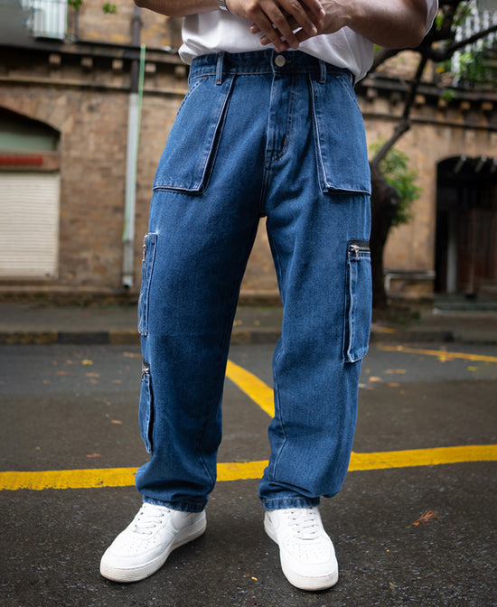 Dark Blue Solid Baggy Fit Cargo Denim Jeans