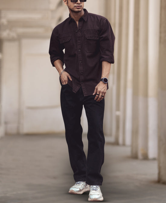 This winter, wear your A-Game. Take a look at our dark brown denim full-sleeved shirts for men, made with 100% cotton denim fabric for utmost comfort and mobility. The full-sleeved shirt features a spread collar, drop shoulders, and flap pockets. Wear it solo or as a layer for effortless elegance.