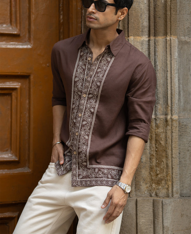 Earthy, detailed, and deeply refined. This dark brown shirt stands out with intricate embroidery that adds character without shouting. The linen blend keeps it breathable, while the rich tone brings depth to your look. Ideal for festive evenings, cultural gatherings, or whenever subtle craftsmanship matters.