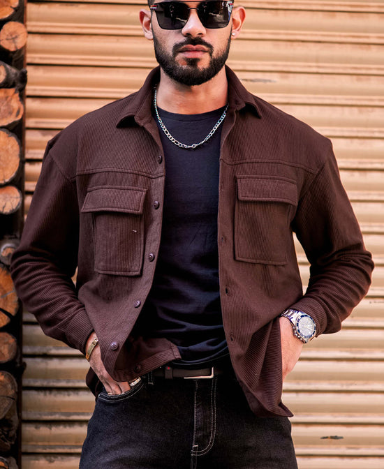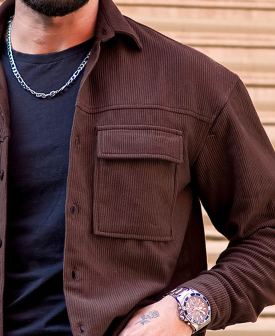 A new texture is running hot in trends and it's corduroy shirts for men. It offers a nuanced and neat look that can be both casual and smart-casual. The corduroy shirt has a buttoned front, drop shoulders, and double chest pockets. It is made of blended cotton corduroy fabric that gives it a lasting iconic appeal. Wear it as an overshirt to nail your winter style goals.