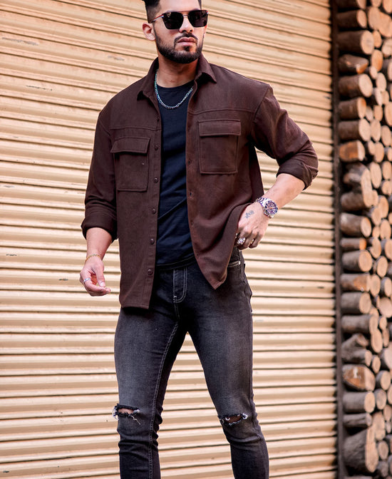 Dark Brown Shacket Pocket Oversize Drop Shoulder Shirt