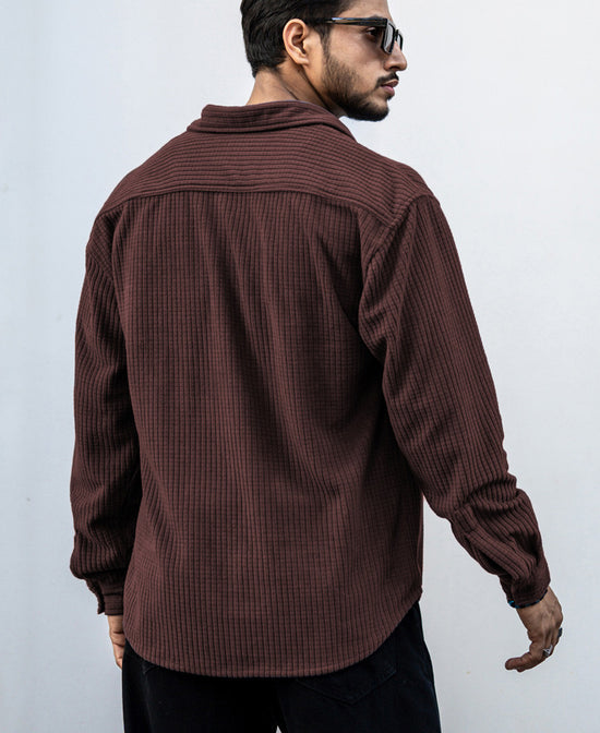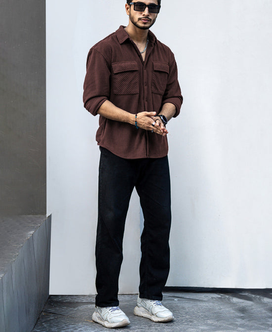 Upgrade to elevated casualwear as comfortable as second skin with our dark brown structured oversized shirts for men, featuring a spread collar, double chest pockets, full sleeves, and drop shoulders. Crafted from textured fabric, the oversized shirt keeps you cool and comfortable all day. Pair it with jeans or layer it over a tee for a minimal statement.