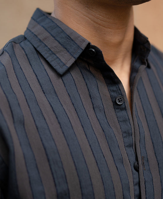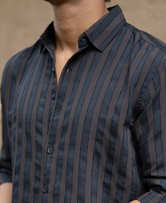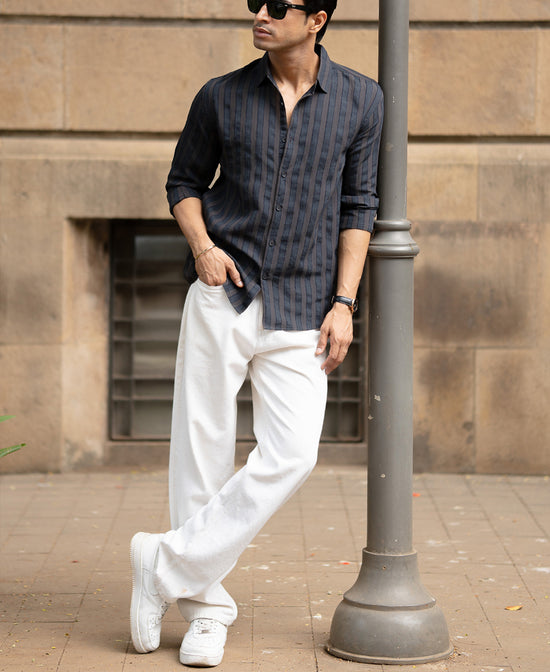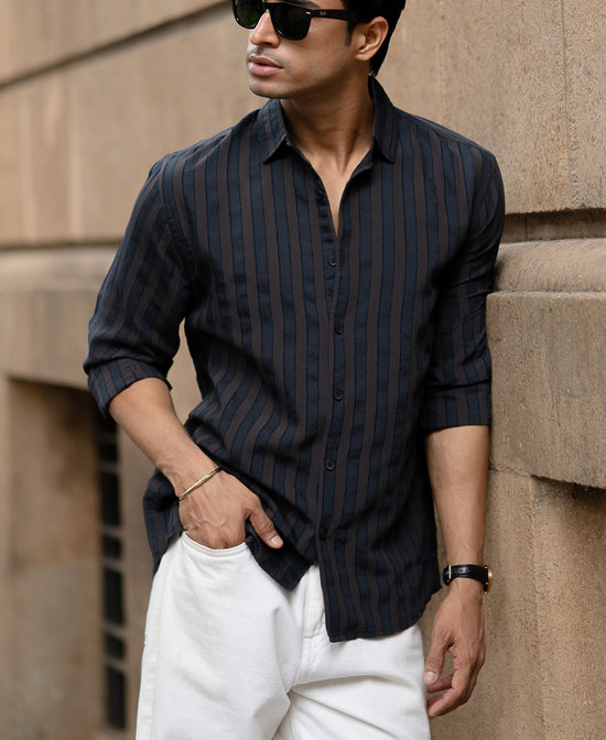 Dark, rich, and a little mysterious, just like your Spotify playlist. This Dark Brown Self Striped Shirt adds quiet depth to your wardrobe with its tone-on-tone texture and neat finish. It’s the kind of shirt that makes you feel grown. Suited for late-night hangs, date nights, or gallery previews.
