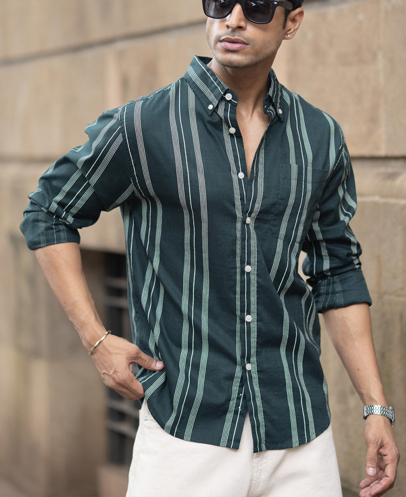 A fresh spin on classic stripes; deep forest green layered with muted vertical lines that elongate, refine, and impress. Light, breathable, and smooth, it’s the shirt you pick when you want to look composed yet effortlessly cool. From brunch fits to evening scenes, this shirt moves with you like a quiet flex.