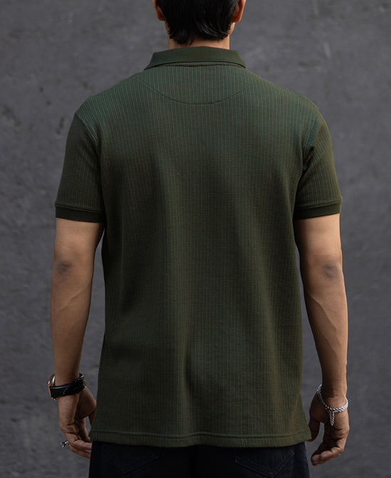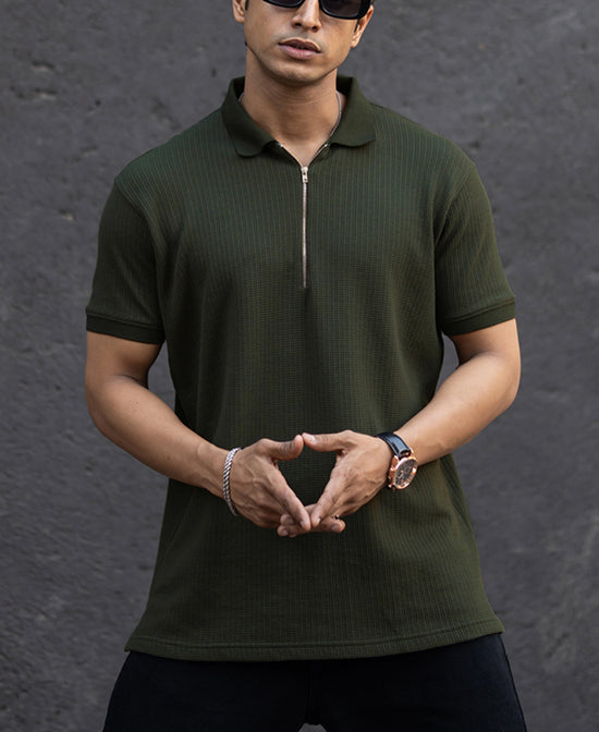 Discover effortless sophistication with our dark green structured t-shirts for men, featuring a zipped polo neck and half sleeves. The rich hue and premium textured fabric elevate this casual staple's style and comfort. Ideal for casual dinners or weekend outings, the slim fit flatters your silhouette, making it a versatile piece for various social settings.