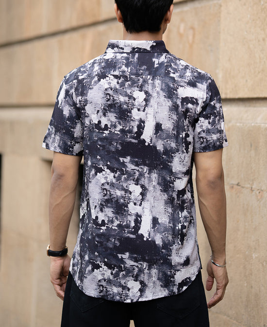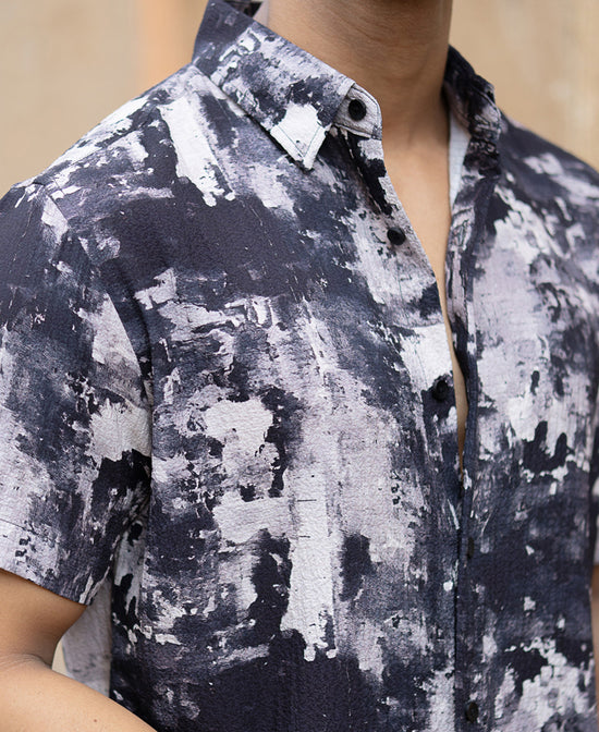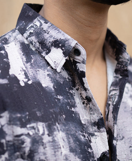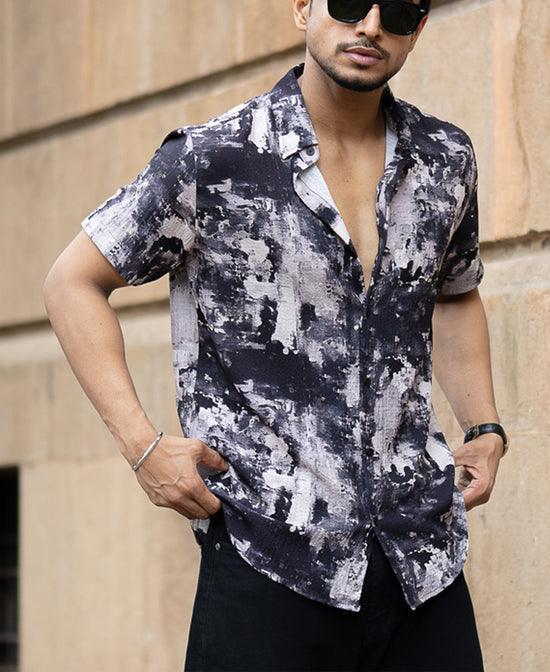 This isn’t just a shirt—it’s mood in motion. With abstract prints on a fluid silhouette, it blurs the line between art and off-duty dressing. The dark grey base anchors the wild side, keeping it wearable from late lunches to loud evenings.