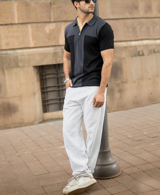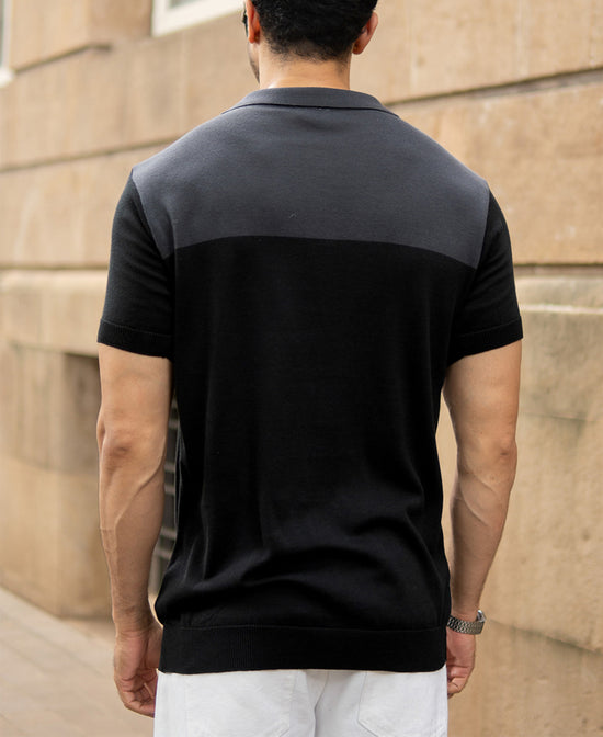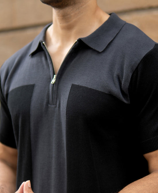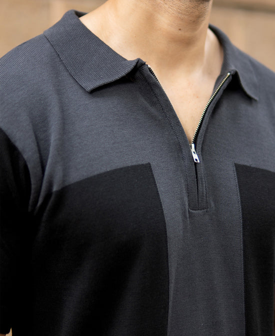 This two-tone grey knit polo pairs a sleek zip placket with soft, breathable fabric. Dark and mid-grey panels give it subtle visual interest, making it a versatile choice for both casual layering and smart-casual looks.