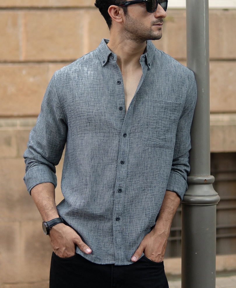 Dark, moody and minimal this slub-textured shirt is designed for the days you want a little edge without effort. With its rich surface texture and cool-toned grey, it plays well with monochrome fits or layered earth tones.