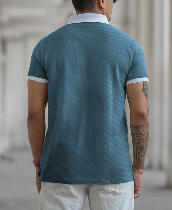 A laid-back classic with a fresh twist. This dark sky blue polo features crisp white contrast detailing on the collar and sleeves, along with a sleek half-zip design. Textured lines add interest, while the fit stays clean and flattering.