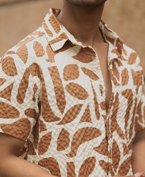 Own the print game. This shirt features a textured fabric layered with bold tan abstract motifs. Breezy on the skin, sharp on the street.