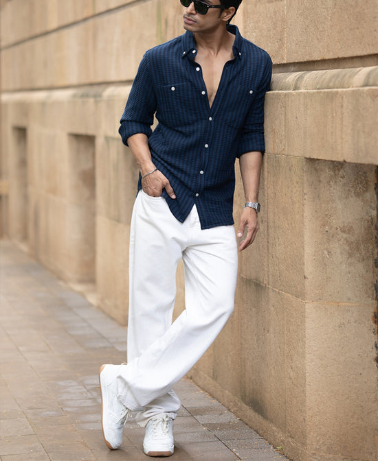 A wardrobe standout, the Denim Knit Structured Stripe Shirt is crafted from a textured knit fabric that blends structure with comfort. Featuring a subtle stripe pattern, buttoned flap pockets, and a deep indigo hue, it’s a versatile choice for dressing up or down. Pair with light jeans for contrast.