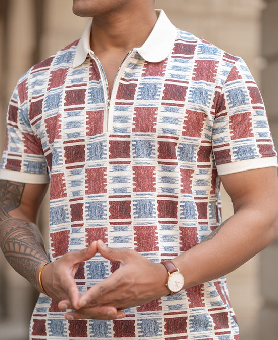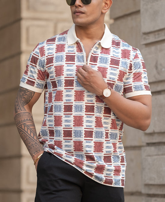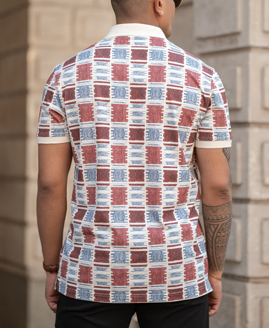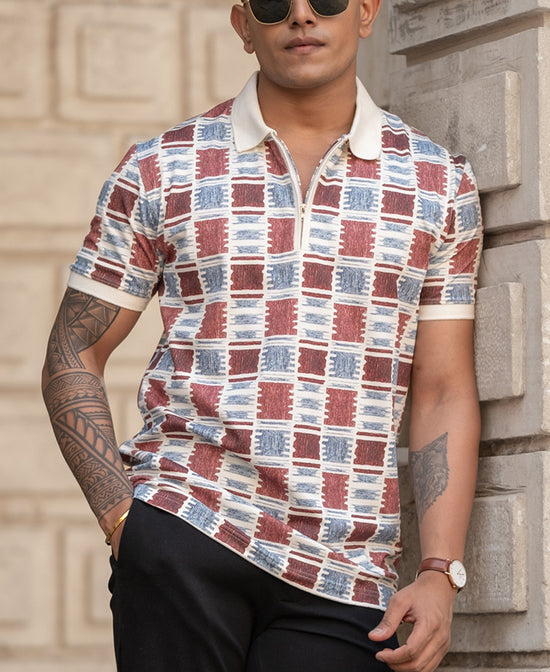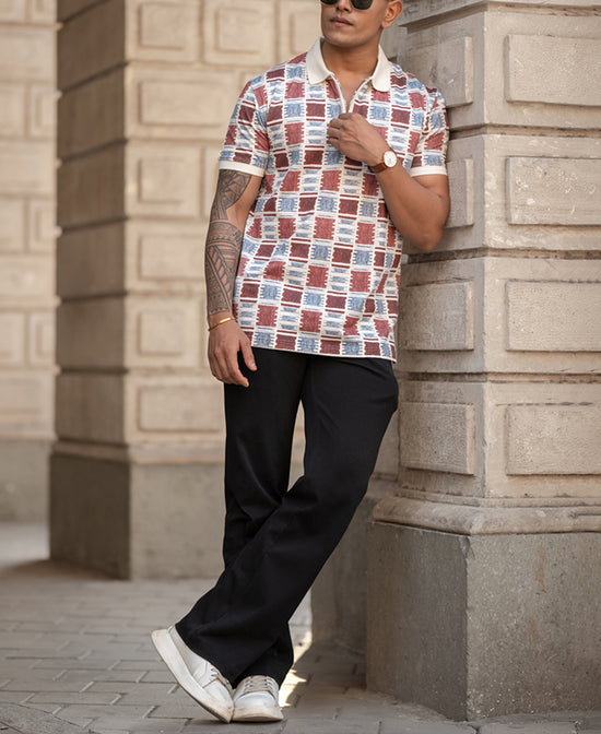 Geometric prints meet polo perfection. This regular-fit tee strikes the right balance between sporty and smart. The breathable fabric ensures all-day comfort, while the classic collar adds a refined touch. Ideal for casual outings, weekend getaways, or even semi-formal settings. Pair it with chinos or jeans, and you're good to go—effortlessly stylish and always comfortable.