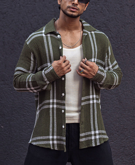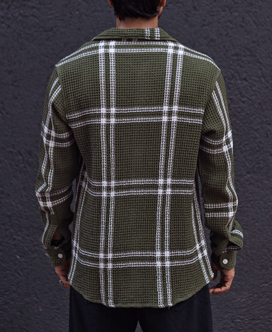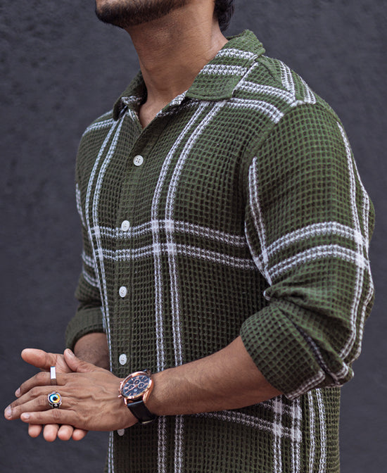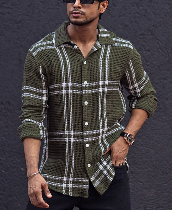 Green and White Striped Waffle Structured Regular fit Full Sleeves Shirt