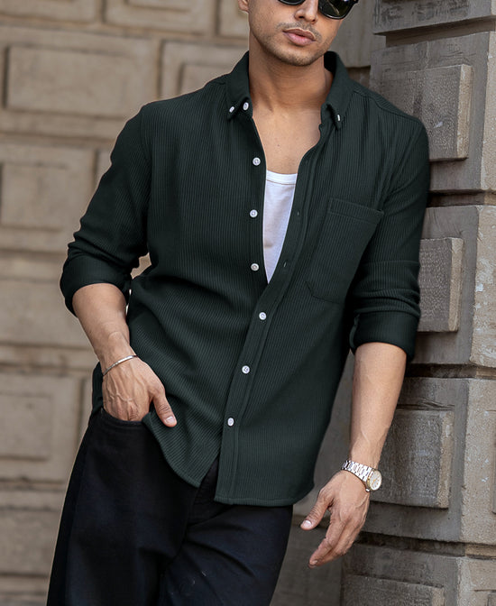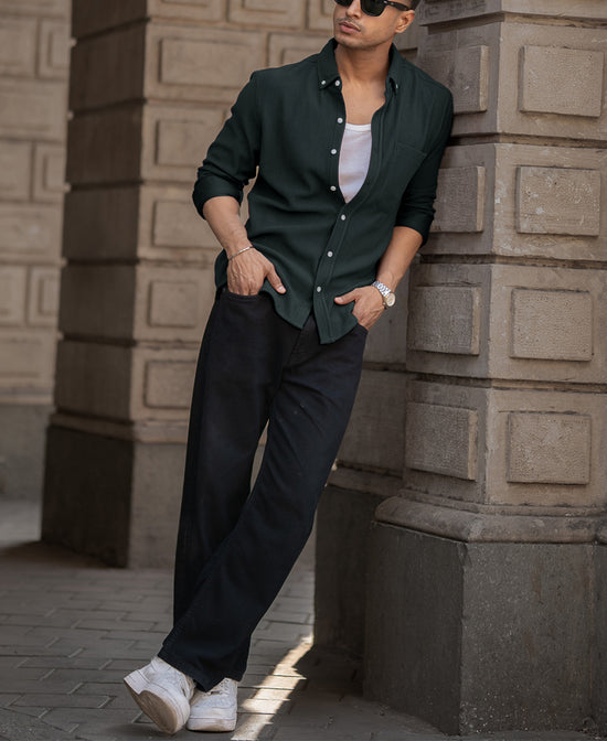 A lush green piece of art that adds a refreshing tone, giving your presence a refined edge; perfect for both casual hangouts and dressed-up moments. Crafted from breathable fabric, this Green Regular Fit Full Sleeves Shirt moves with you effortlessly. Button it up for a polished look, or wear it open over a tee for laid-back charm—either way, you own the room.