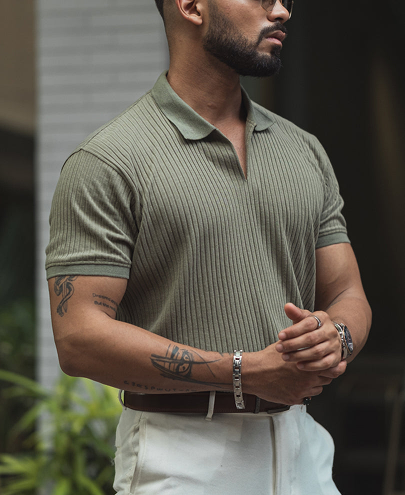 Add sophistication to your clothing ensemble with this Green Solid Structured Half Sleeve T-Shirt. In a distinctive stone green grey tinge, it combines the crispiness of structured knit fabric with a collar neck. The regular fit ensures a smart casual look, making this green half sleeve t-shirt a versatile choice.