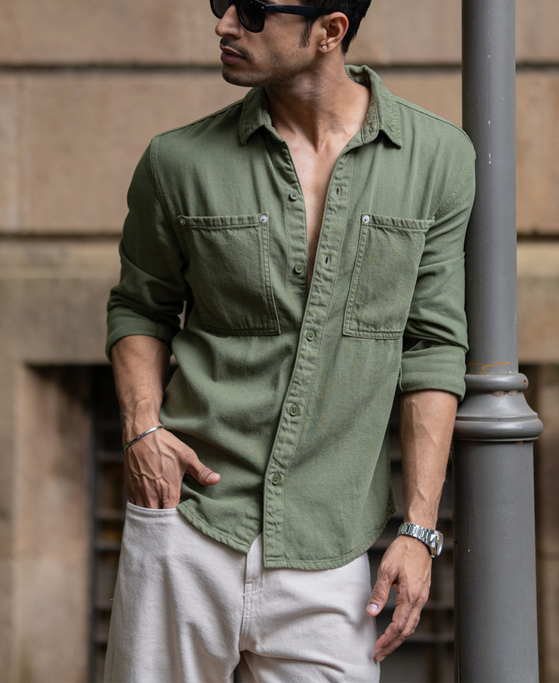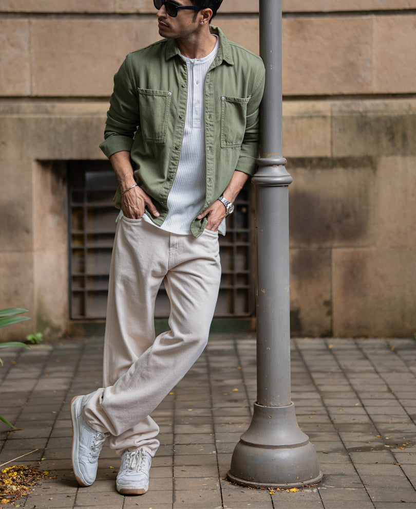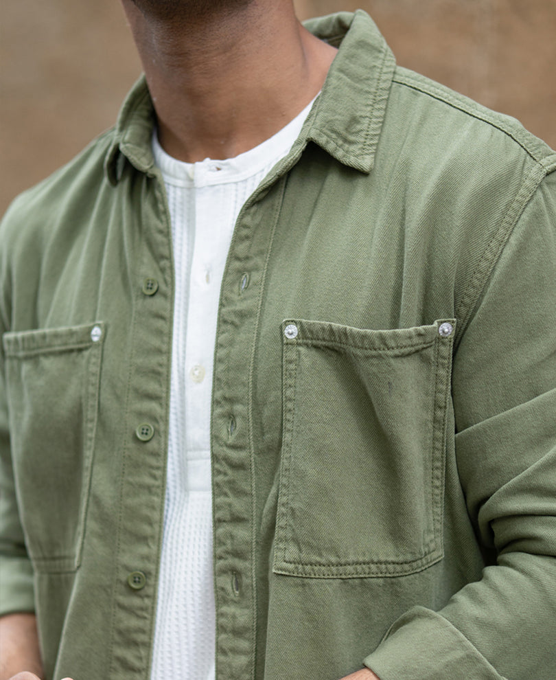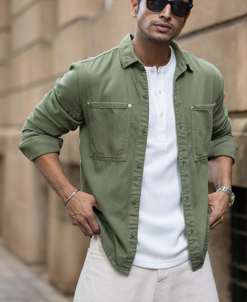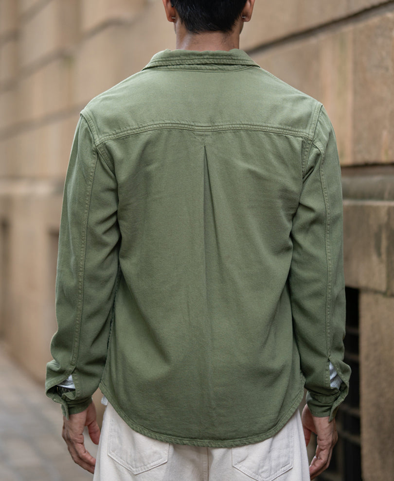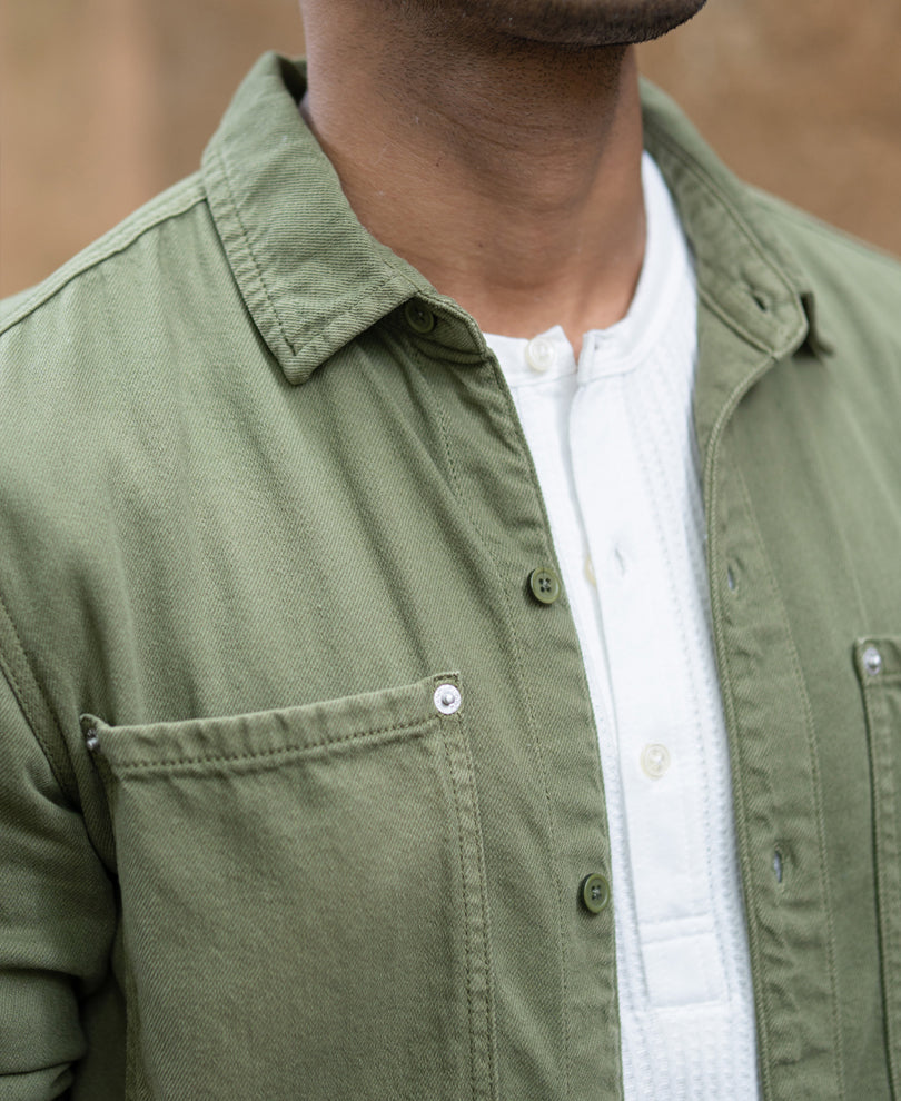 A utility-inspired overshirt cut from textured cotton that feels both structured and breathable. Its earthy tone and boxy fit make it an easy layer across seasons. Works just as well over cargos as it does with denims.
