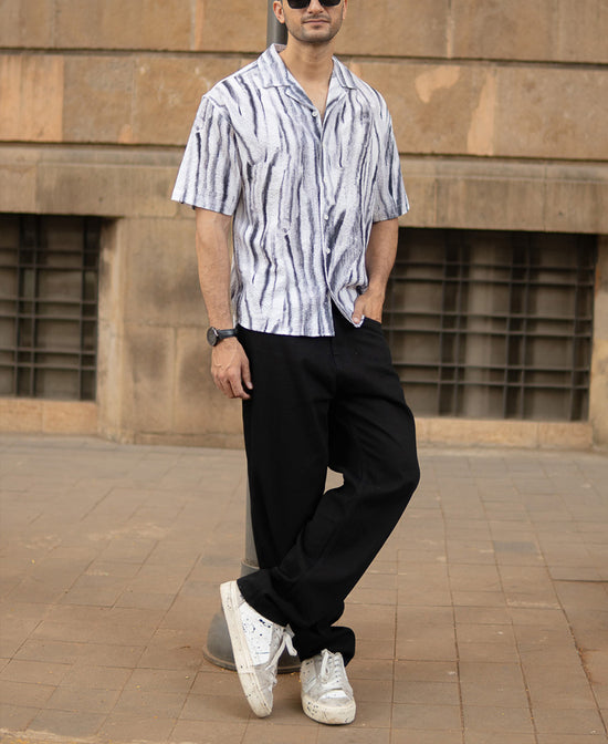 Make room for creative rhythm in your wardrobe with this Grey Abstract Print Structured Shirt. Designed like brushstrokes on a canvas, it blends artsy rebellion with a laid-back resort vibe. It features a modern, eye-catching abstract print in a cool grey hue with a textured weave that allows you to take risks comfortably