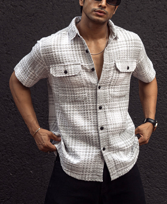 Grey and Off White Regular Fit Waffle Checks Shirt