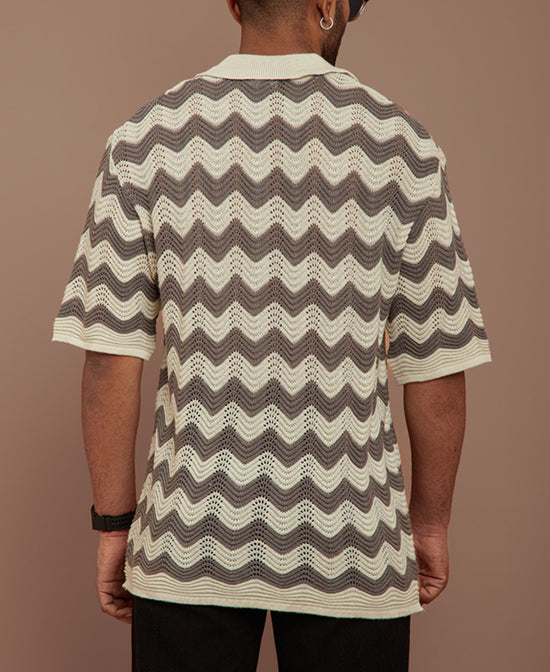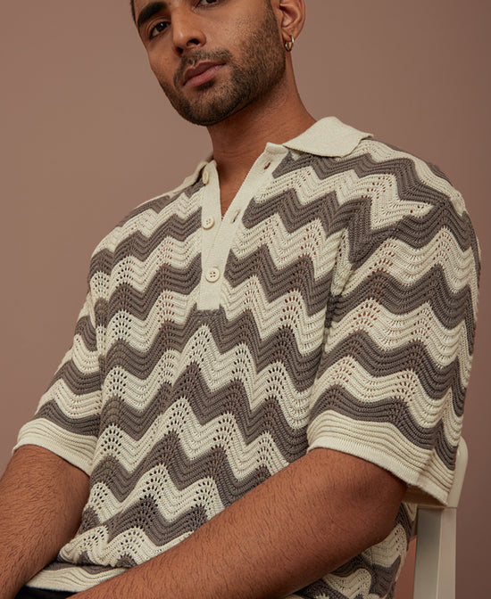Embrace retro vibes with our grey and white oversized t-shirts for men, featuring a striking chevron pattern, and a classic polo collar with a buttoned placket. The oversized t-shirt's relaxed fit ensures comfort, while the unique knit texture adds a stylish touch. Perfect for casual outings, it flies with jeans, shorts, and trousers.