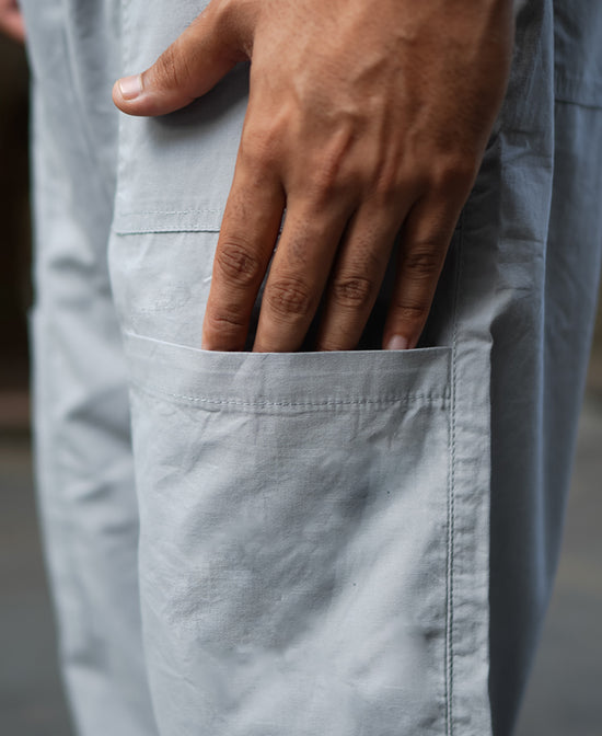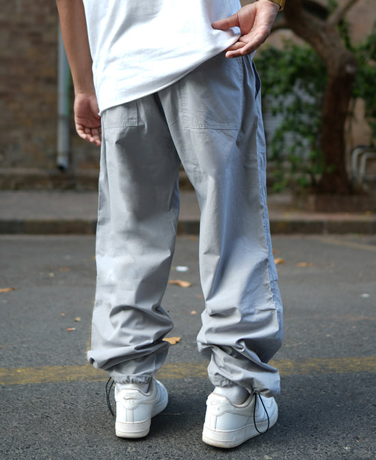 Add to bag: extra comfort, style, and space with our light grey baggy parachute pants for men, featuring long utility pockets and a stitched finish. Made from premium denim, the pants will give you unmatched comfort for years. Top it off with a tee or shirt to elevate your everyday outfits.