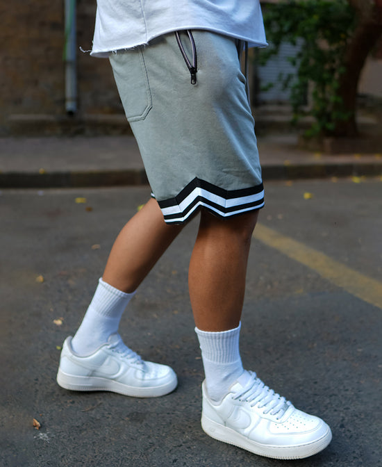 Step up to premium athleisure with our grey baggy-fit shorts for men, featuring a custom-fit drawstring waist and smart pockets. Made from soft, breathable fabric, the shorts' black and white striped hems give any fit a sporty edge. Perfect for workouts or casual outings, these shorts offer the best of functionality and style effortlessly.