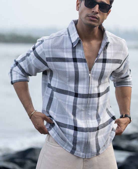 This grey checked overshirt blends structure with movement, bringing a tailored yet easy silhouette. The zip front adds convenience with a touch of edge, turning this into a perfect “grab and go but look amazing anyway” layer.