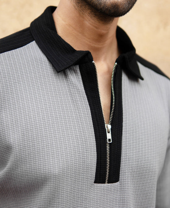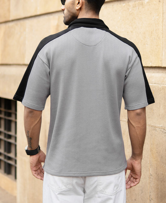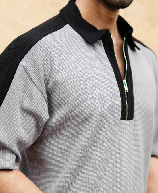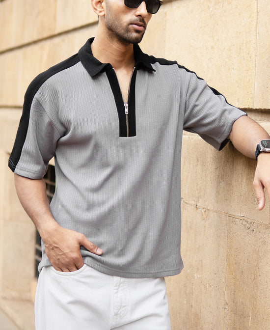 A contemporary staple to stay sleek with a sporty edge, this grey t-shirt features textured rib-knit fabric and strong contrast paneling across the collar and sleeves. The half-zip front and bold black accents make it stand out, while the breathable structure ensures all-day ease.