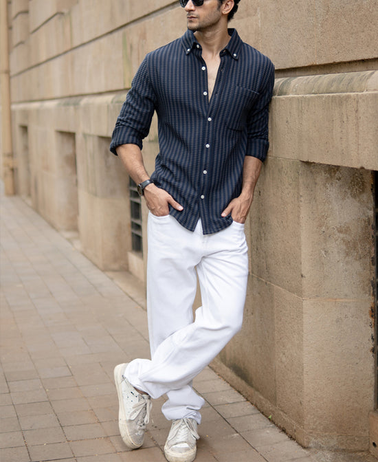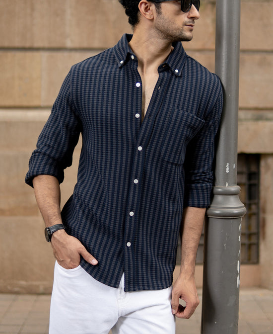 A refined take on casual styling, this piece is tailored from a textured knit fabric that brings depth to its vertical stripe pattern. The grey tones make it versatile for both weekday layering and weekend styling. Featuring a sharp button-down collar, clean placket, and adjustable cuffs, it offers both polish and comfort. The structured knit holds its shape beautifully, making it an easy upgrade from standard cotton shirts.