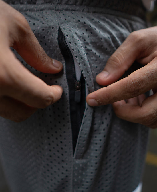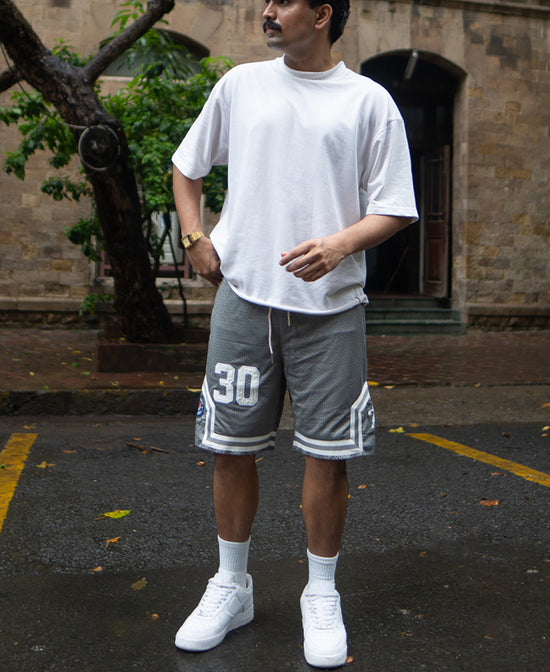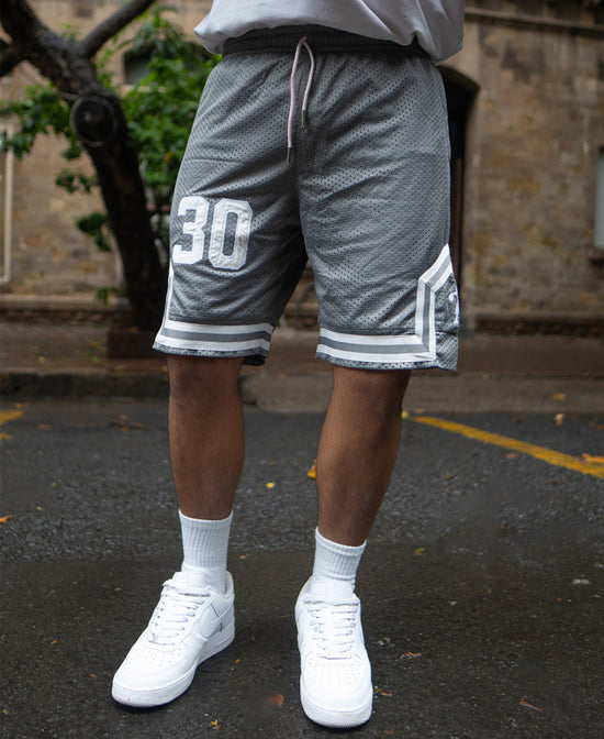 Sporty, breathable, and street-ready. These grey mesh shorts feature contrast trims, a drawstring waist, and a bold ‘30’ print for a vintage jersey look. Whether you're hitting the court or chilling on the weekend, they bring game-day energy with all-day comfort.