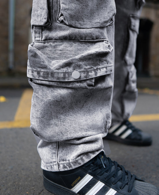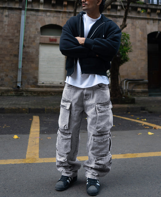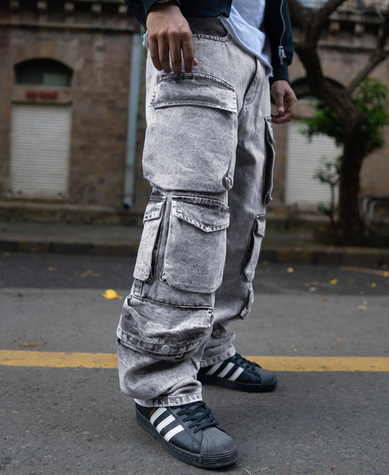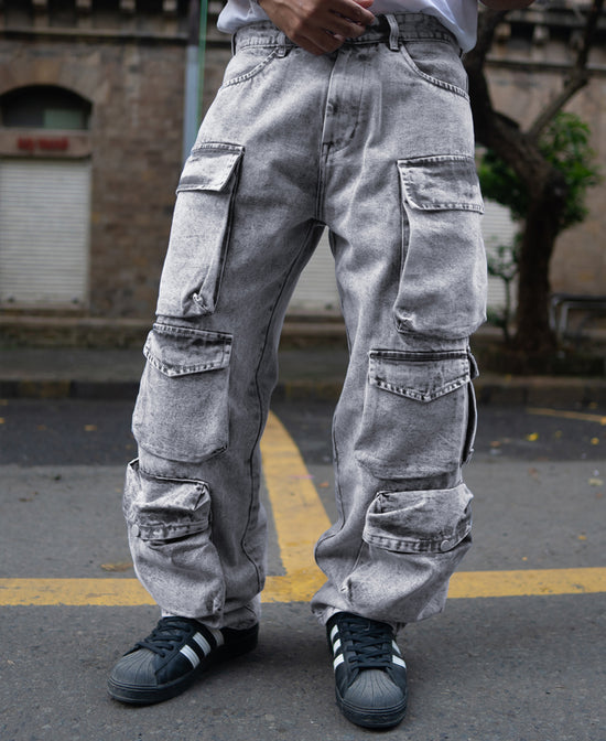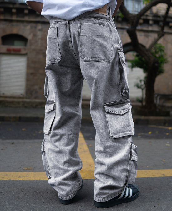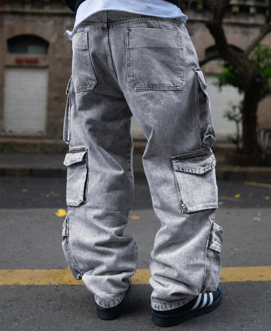 Grey Multi Pockets Baggy Fit Cargo Denim Jeans